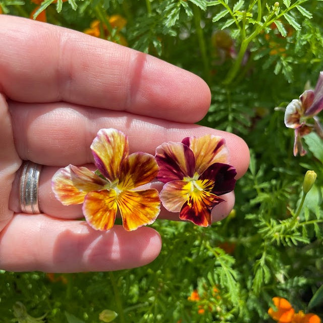 Fabulous antique looking edible flowers! The painter inside of me just wants to paint these all day long. They have fabulous stripes of contrasting purples, yellows, oranges and lemons. Edible and so much fun to look at. Small plants (6”tall ) are short-lived perennials.